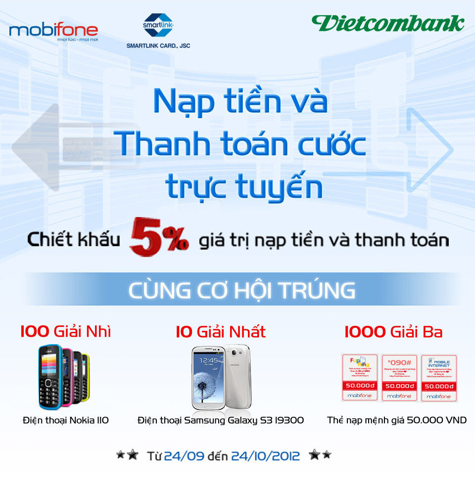Chương trình khuyến mại dành cho thẻ Vietcombank Connect 24 khi thanh toán qua Mobifone Portal Kính gửi Quý khách hàng,Vietcombank xin gửi tới Quý khách lời chào trân trọng và cảm ơn Quý khách đã lựa chọn sử dụng sản phẩm dịch vụ thẻ của chúng tôi trong thời gian qua.Vietcombank xin trân trọng gửi tới quý khách chương trình ưu đãi dành cho các chủ thẻ khi nạp tiền trả trước và thanh toán cước trả sau qua cổng thanh toán điện tử Smartlink trên Mobifone Portal bằng thẻ Vietcombank Connect24 từ ngày 24/09/2012 đến 24/10/2012.Để biết thêm thông tin chi tiết, Quý khách vui lòng truy cập website: http://www.vietcombank.com.vn.